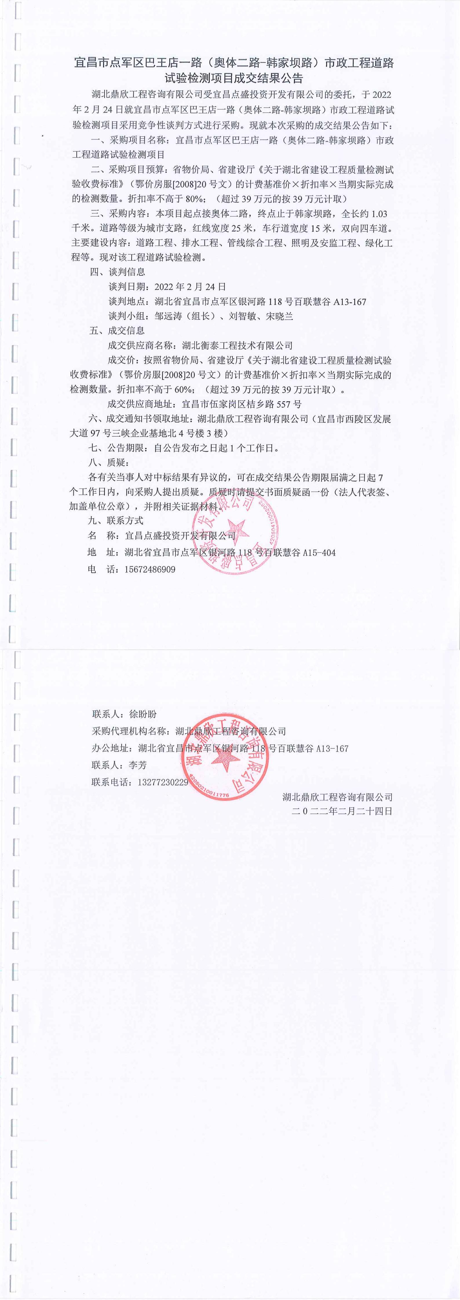 宜昌市點(diǎn)軍區(qū)巴王店一路(奧體二路-韓家壩路)市政工程道路試驗(yàn)檢測(cè)項(xiàng)目成交公告