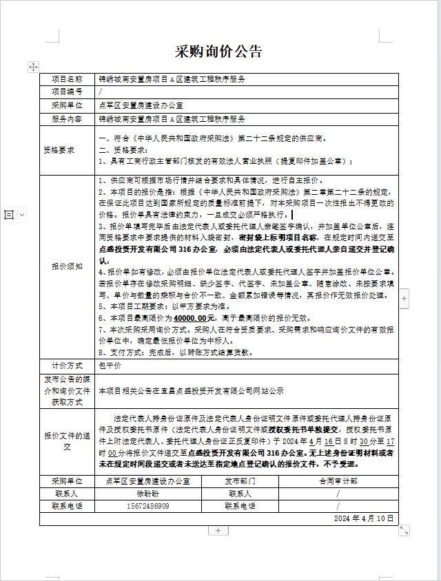 錦繡城南安置房項(xiàng)目A區(qū)建筑工程秩序服務(wù)詢價(jià)公告