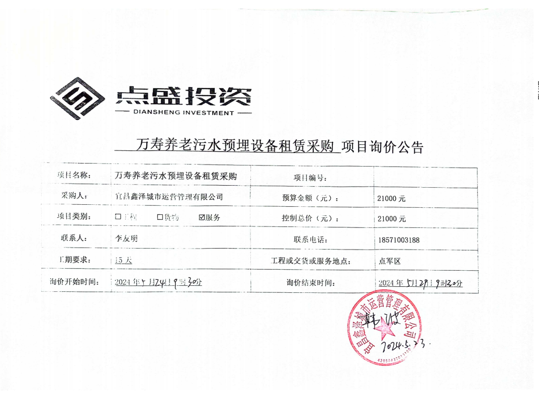 萬(wàn)壽養(yǎng)老污水預(yù)埋設(shè)備租賃采購(gòu)詢(xún)價(jià)公告
