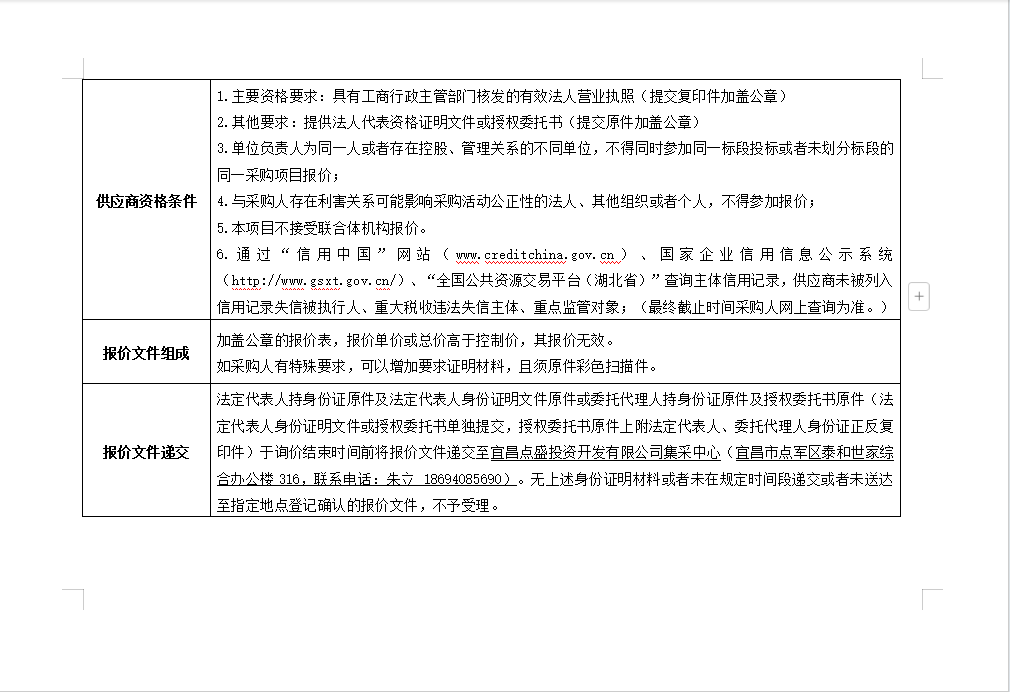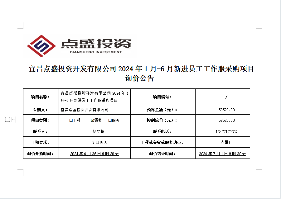 宜昌點(diǎn)盛投資開發(fā)有限公司2024年1月-6月新進(jìn)員工工作服采購(gòu)項(xiàng)目詢價(jià)公告