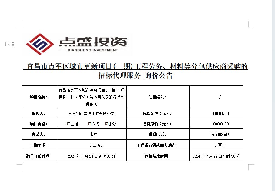 宜昌市點(diǎn)軍區(qū)城市更新項(xiàng)目(一期)工程勞務(wù)、材料等分包供應(yīng)商采購(gòu)的招標(biāo)代理服務(wù)詢(xún)價(jià)公告