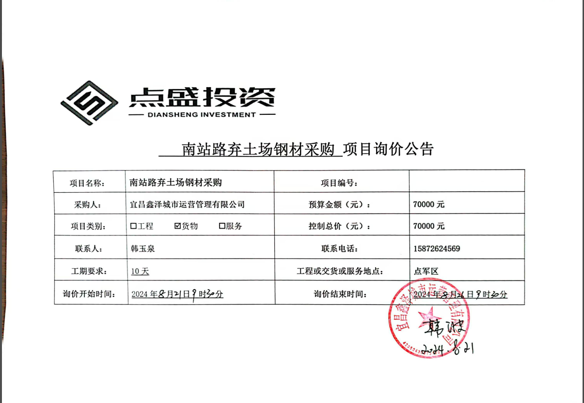 南站路棄土場(chǎng)鋼材采購項(xiàng)目詢價(jià)公告