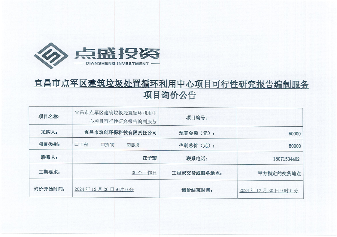 宜昌市點(diǎn)軍區(qū)建筑垃圾處置循環(huán)利用中心項(xiàng)目可行性研究報(bào)告編制服務(wù)項(xiàng)目詢(xún)價(jià)公告