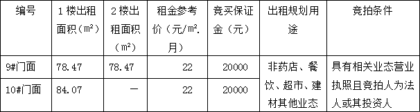 上述第9號門面房整體出租1至2樓,10#門面房只出租一樓。目前,上述門面房均處于空置的毛坯狀態(tài),現(xiàn)狀分別對外出租。相關(guān)競買事項詳見本公司拍賣資料中的《競買協(xié)議》樣本特別說明條款內(nèi)容,且標(biāo)的物自公告之日起至2021年12月10日17:00止,在標(biāo)的物現(xiàn)場展示(集中看房時間定于2021年12月10日8:30-12:00,14:00-17:00)。